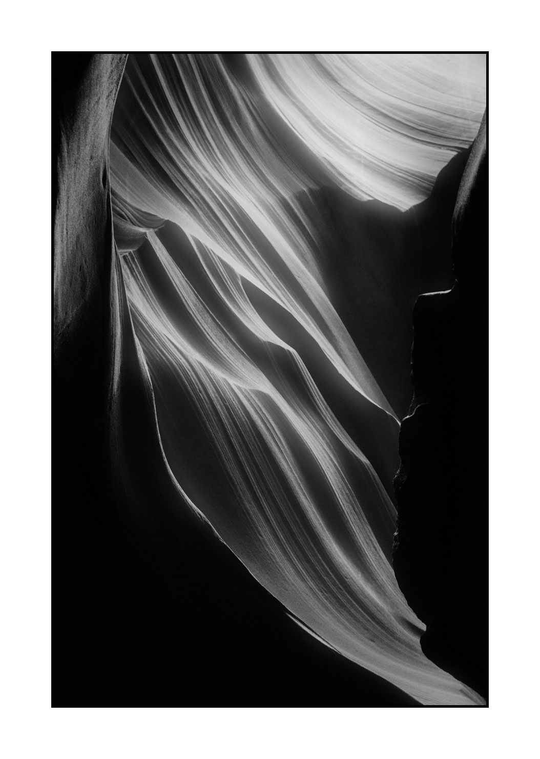 Landscape of Antelope Canyon in Black and White XVII: Museum Finish Dim in inches - Photo: 15 x 10. With frame: 20.1 x 15.1. / Dim in cm - Photo: 38 x 25.4. With frame: 51 x 38.5.