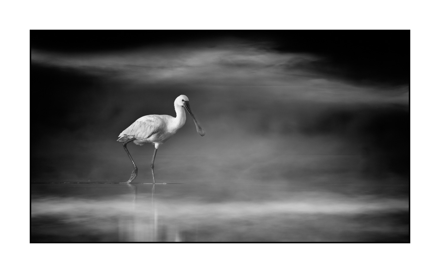 Eurasian Spoonbill in Black and White III: Museum Finish Dim in inches - Photo: 24 x 13.5. With frame: 25.2 x 14.7. / Dim in cm - Photo: 61 x 34. With frame: 64 x 37.5.