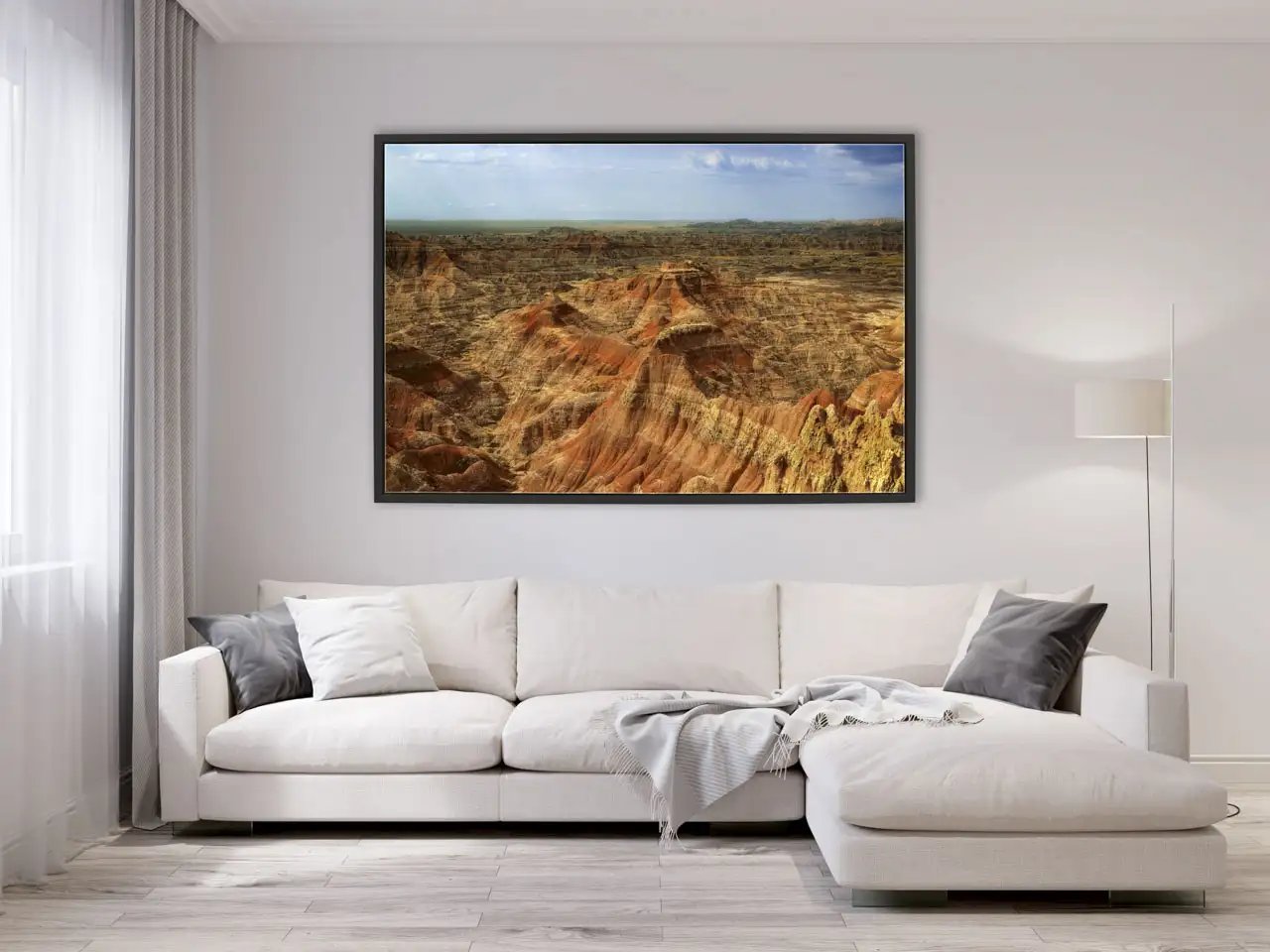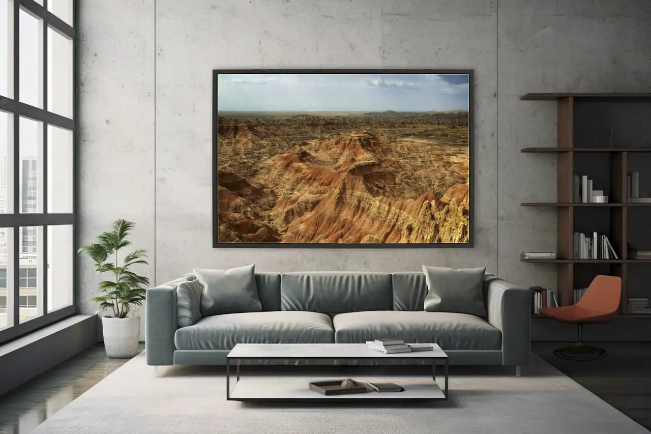 In your home, this work becomes more than decoration-it becomes presence. It transforms walls into horizons, corners into sanctuaries. Guests will not merely see it; they will feel it-an unspoken reverence that awakens admiration and curiosity. They will sense the story behind the glow, the patience of erosion, the eternal rhythm of wind and silence that shaped the Badlands in South Dakota long before we arrived to witness them.