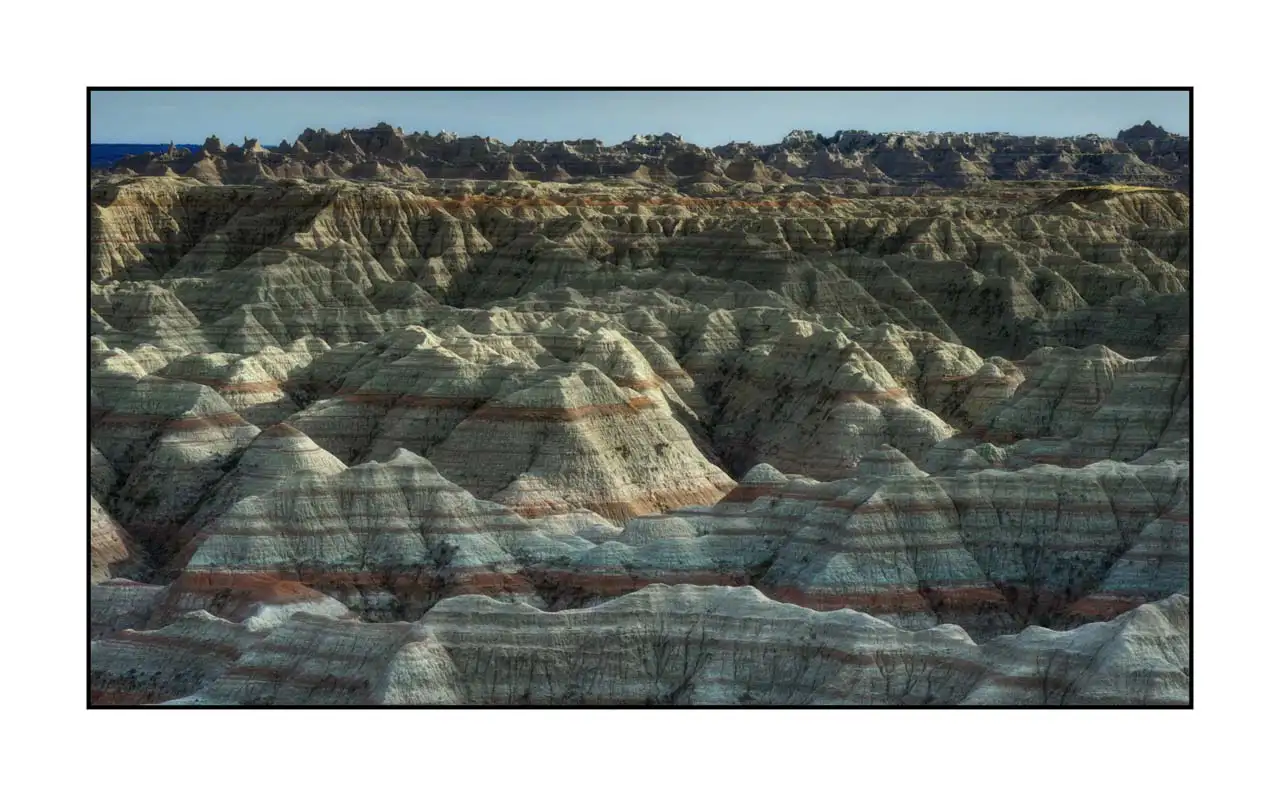 Silent Hymn of the Earth VIII - Landscape of Badlands in South Dakota: Museum Finish Dim in inches - Photo: 32 x 18. With frame: 33.2 x 19.2. / Dim in cm - Photo: 81 x 46. With frame: 84.5 x 49.