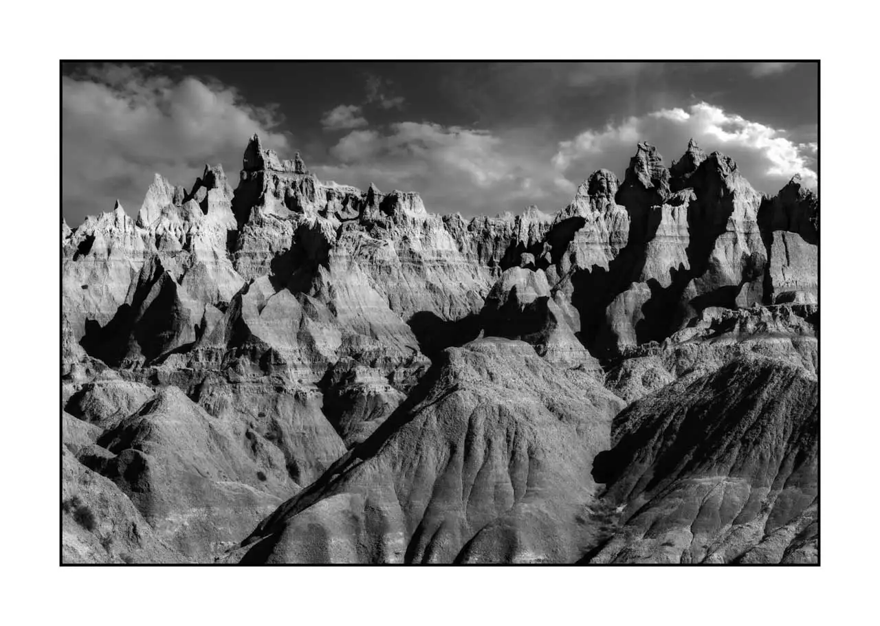 Echoe of Time V - Black and White Landscape of Badlands in South Dakota: Museum Finish Dim in inches - Photo: 12 x 8. With Frame: 13.2 x 9.2. / Dim in cm - Photo: 31 x 20. With frame: 33.5 x 23.5.