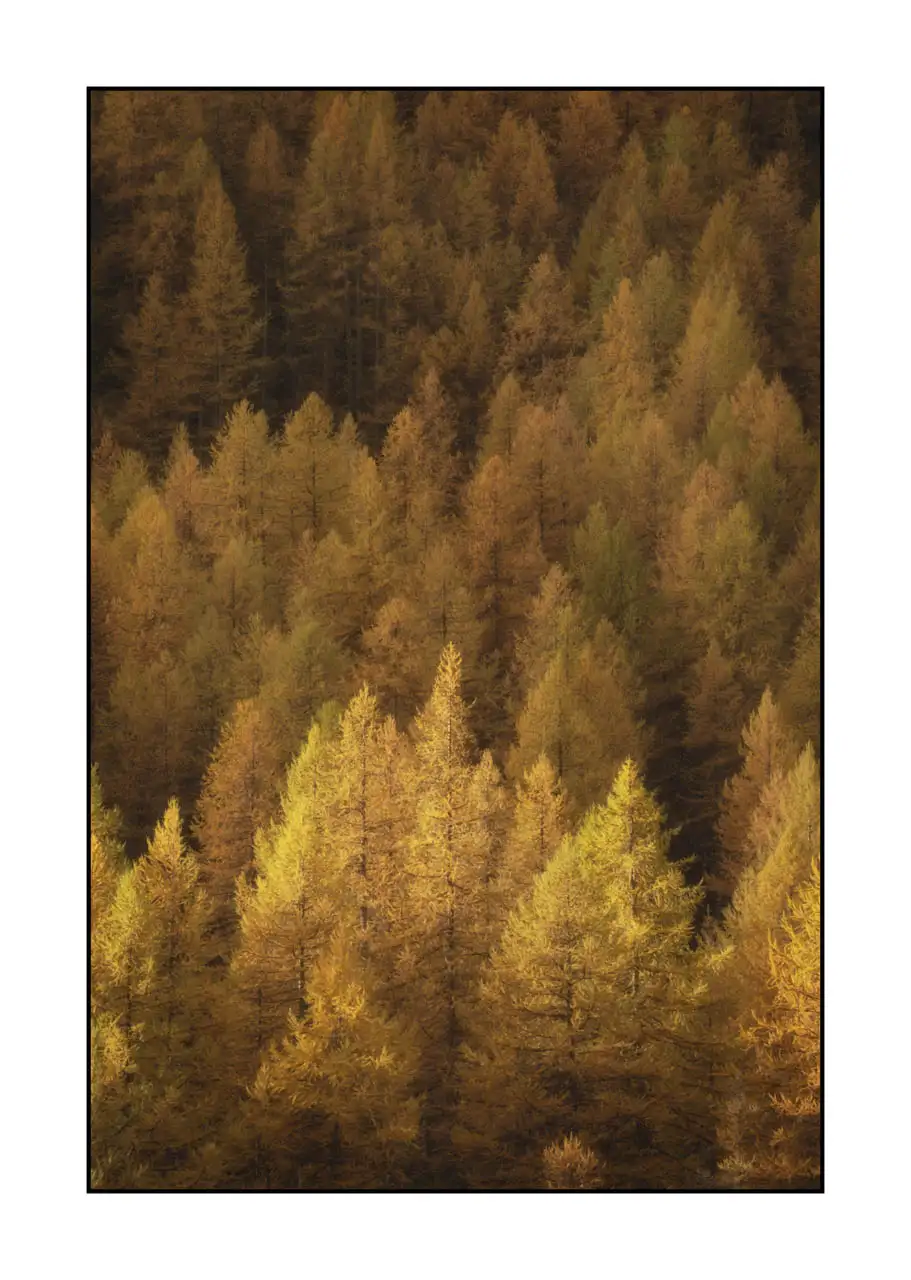 As you gaze upon these artworks of landscapes, you are invited to step into a sanctuary of golden whispers and tranquil strength. The valley's autumnal larch trees glow like celestial candles, their warm hues shimmering against the steadfast mountains that cradle them. It is as if the valley itself is alive, breathing out peace, calling you to reconnect with the essence of life: beauty, stillness, and wonder.