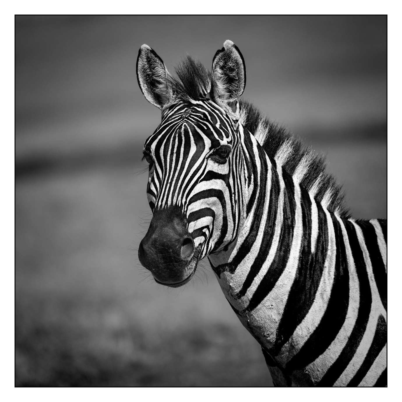 Zebra IV: Museum Finish Dim in inches - photo: 20 x 20. With Frame: 21.2 x 21.2 / Dim in cm - photo: 51 x 51. With frame: 54 x 54.