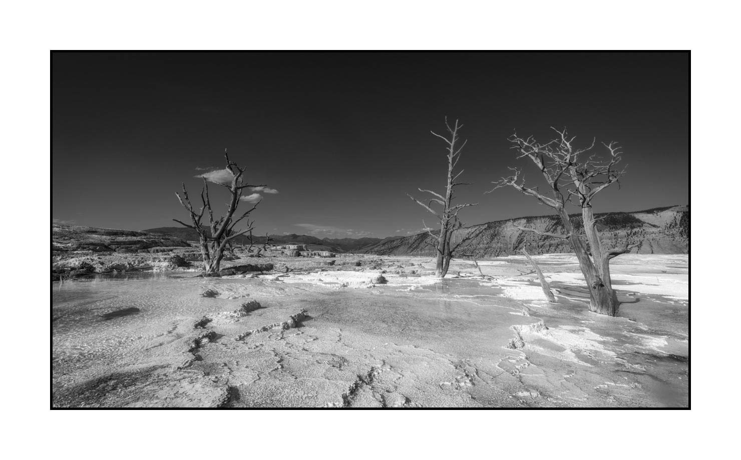 Paysage du Yellowstone dans le Wyoming en noir et blanc XX. Arbres desséchés sur une terrasse à Mammoth Hot Springs.
