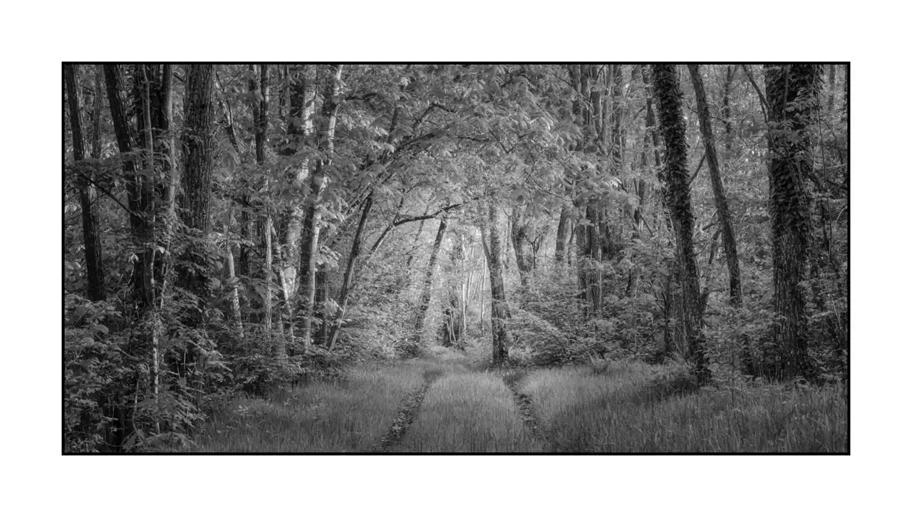 Les sentiers silencieux de la Dombes III - Paysage en noir et blanc d'un chemin dans un sous-bois en Dombes: Finition museum Photo : 80cm x 40cm. Avec cadre : 93cm x 53cm.